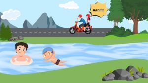 Aan  : “Kamu benar Zaka, jika kita pulang dahulu maka waktu nanti akan semakin sore, baiklah ayo cepat ajari aku berenang lagi agar mahir seperti kamu”